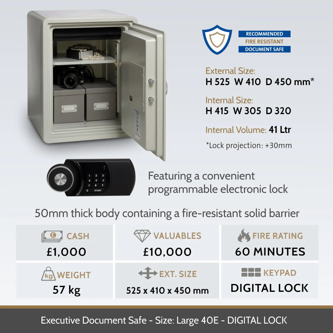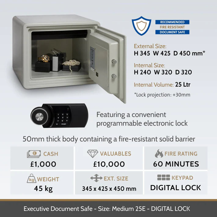 The Executive Cabinet is constructed with an overall body thickness of 50mm, comprising an inner and outer steel body, containing a specially formulated fire-resistant solid barrier material. Doors are constructed with an overall thickness of 66mm.